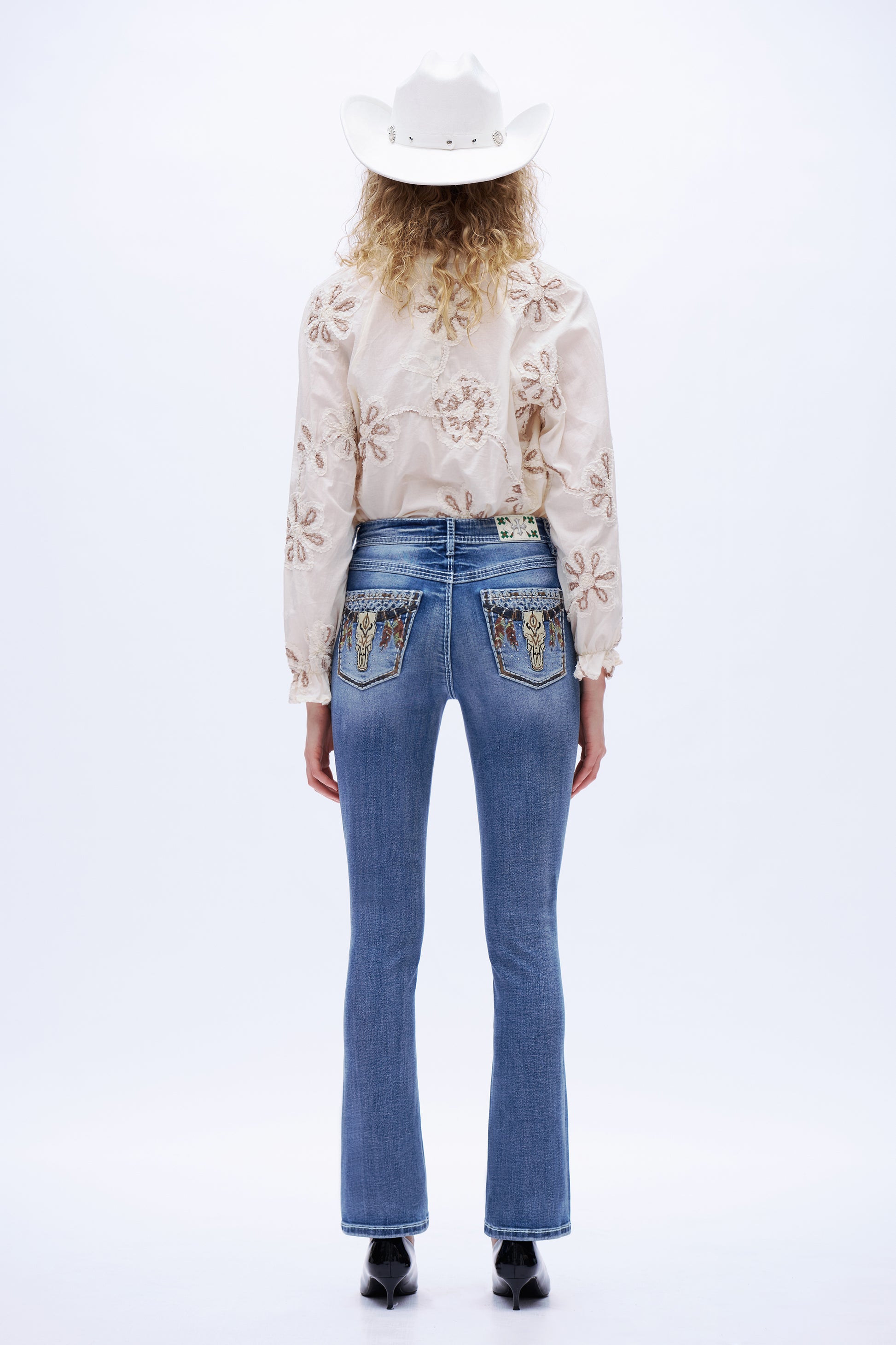 High-rise bootcut jeans in medium blue with bull and feather back embroidery, subtle whiskering, and stretchy, leg-flattering fit.