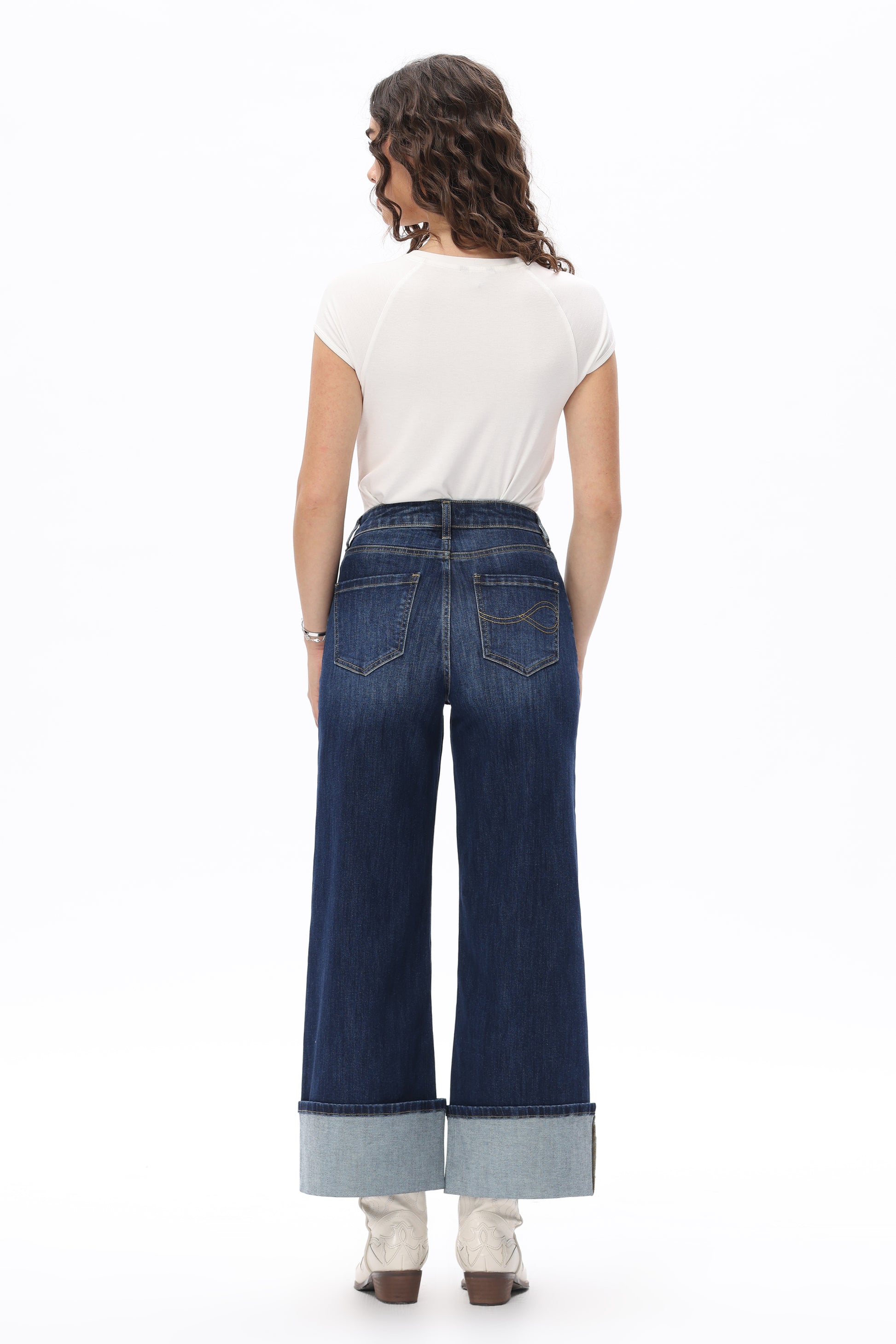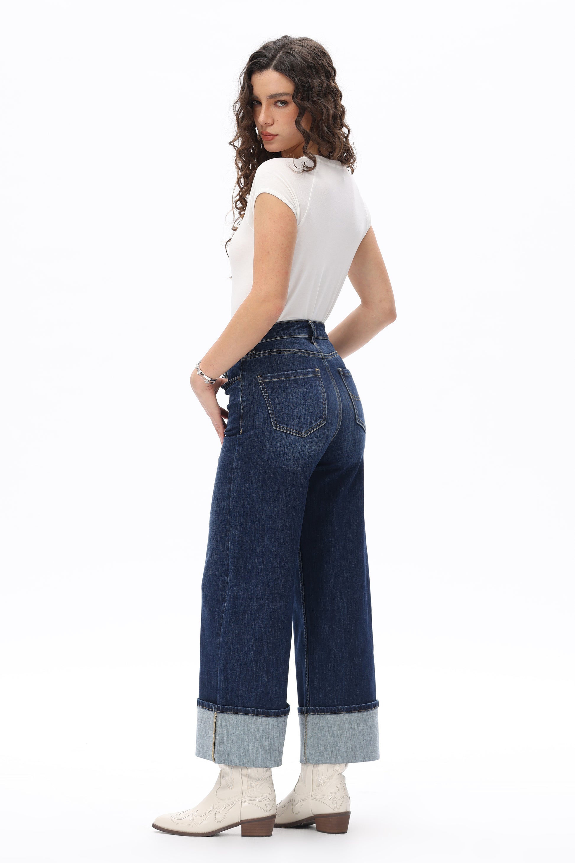 High-rise wide-leg jeans with oversized cuffed hems and stretchy fit for a sleek, leg-lengthening silhouette in dark wash denim.