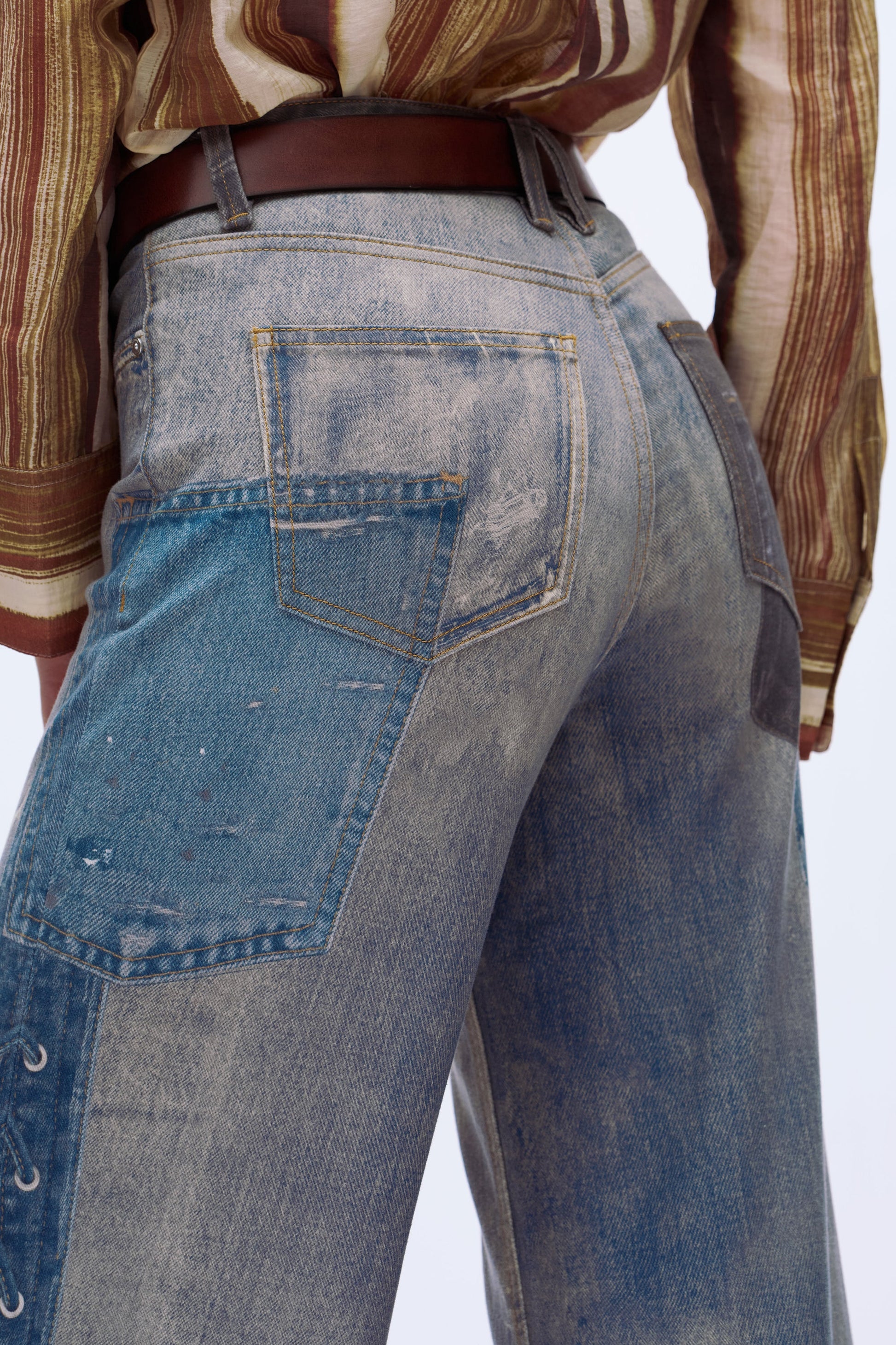 High-rise wide-leg patchwork jeans in multi-tonal blue with bold paneling, color-block details, and stretchy, statement streetwear fit.