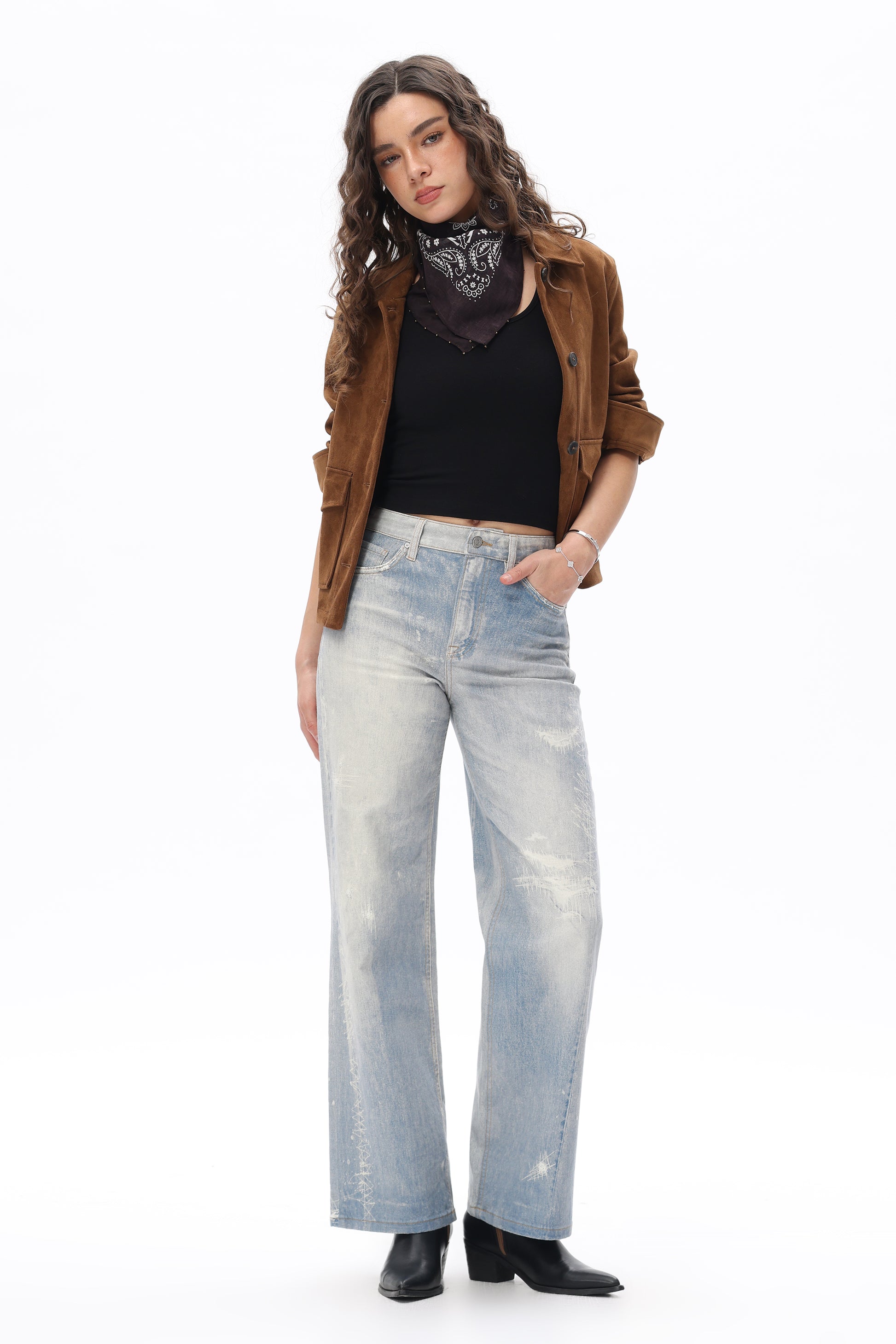 High-rise wide-leg jeans with five-pocket design, stretchy comfort, and a sleek, 90s-inspired fit.