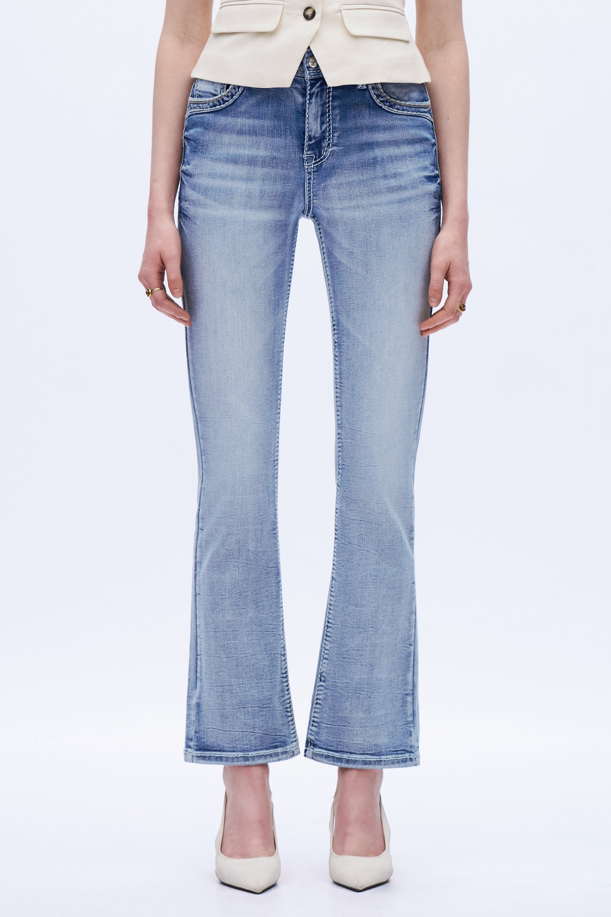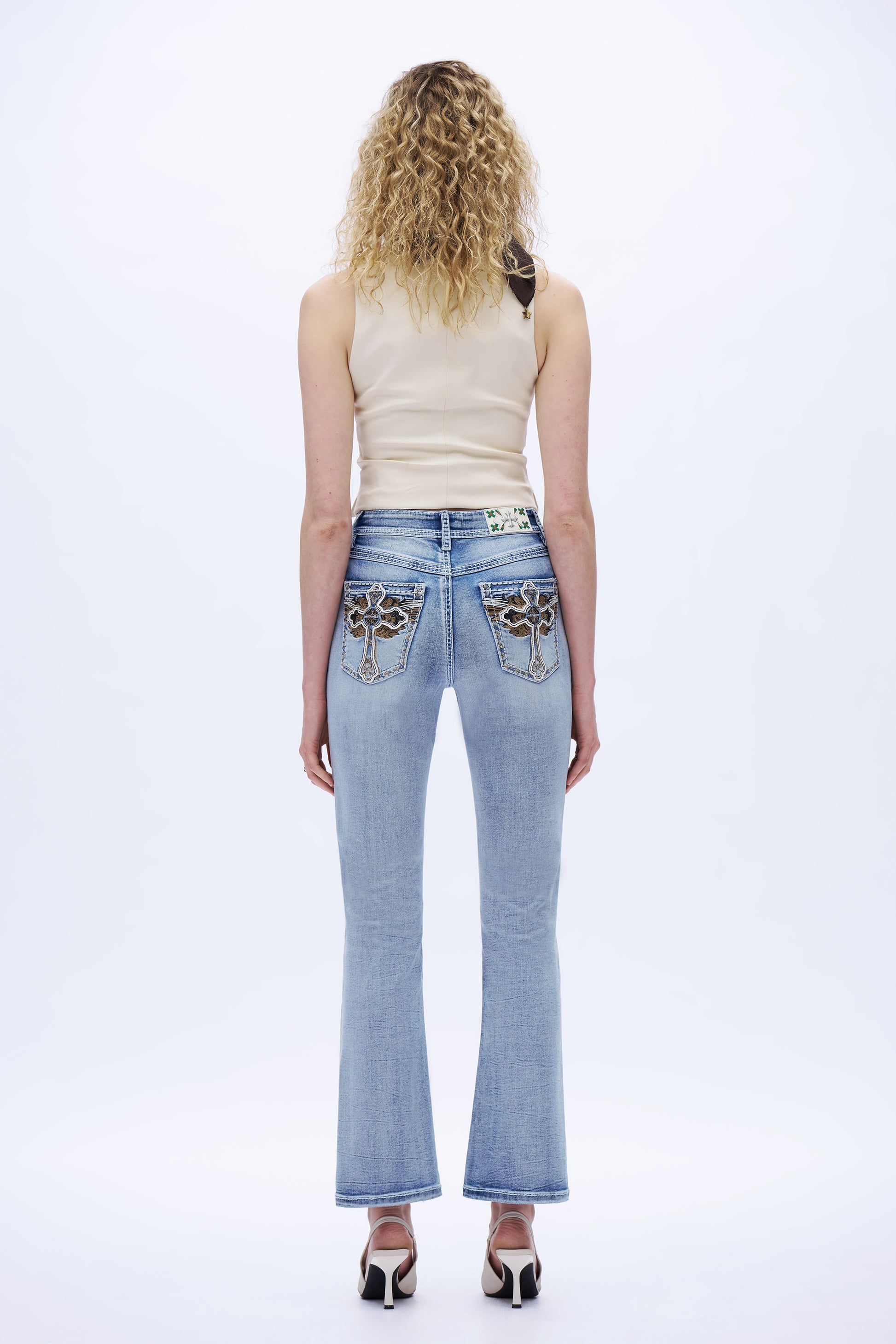 Mid-rise bootcut jeans in vintage light blue with angel-wing back embroidery, raw hem, and comfy stretch for a chic, elongated look.